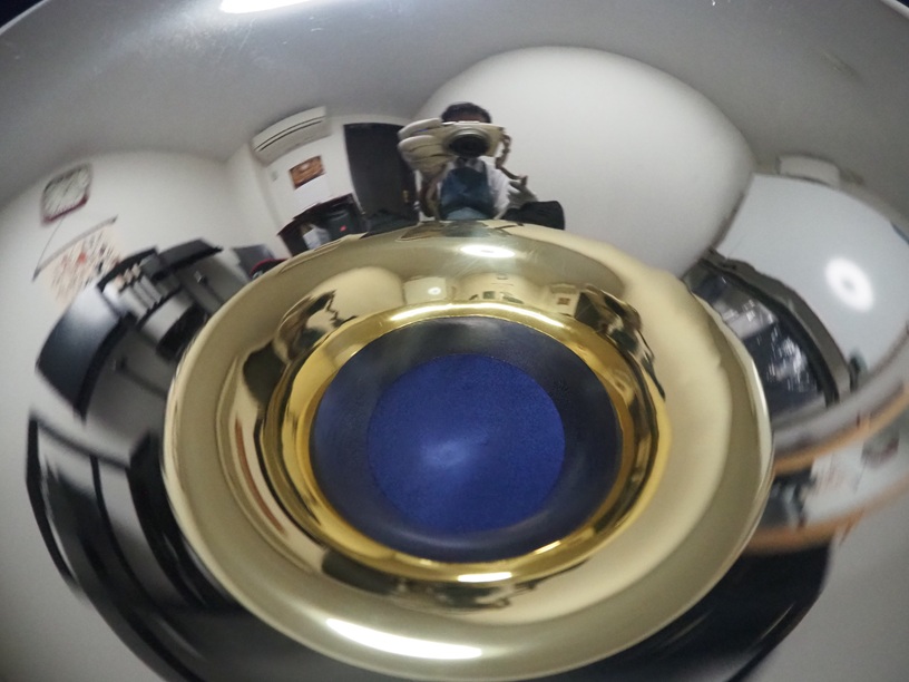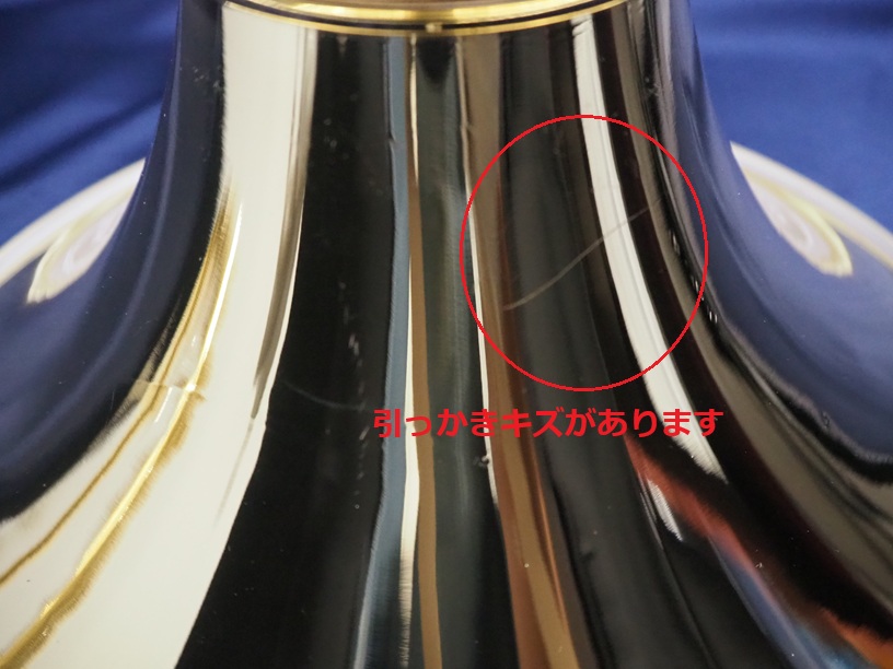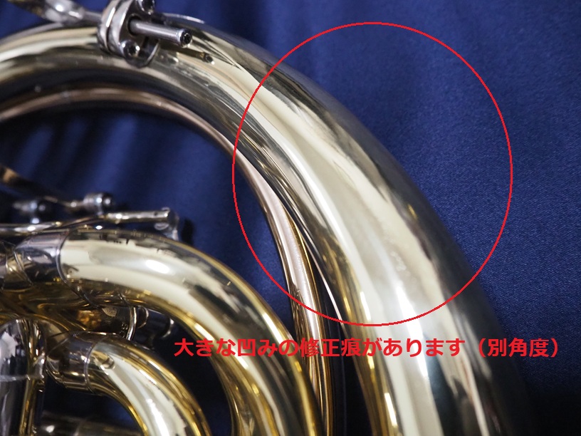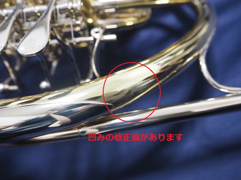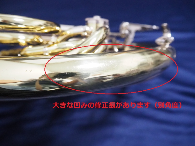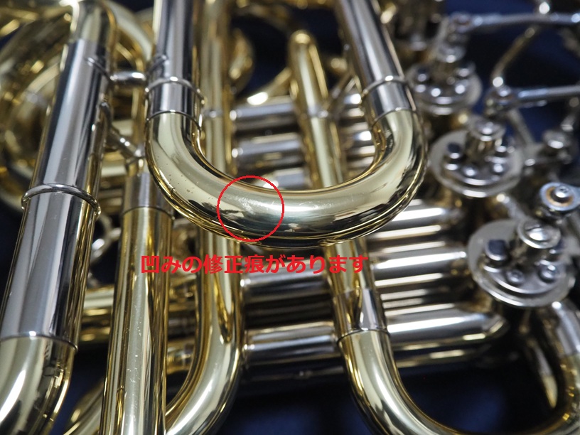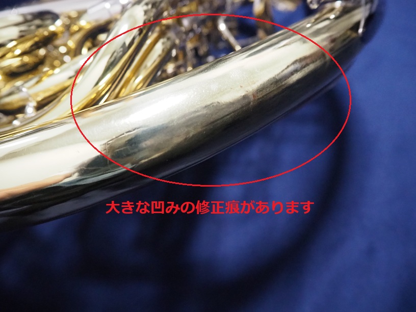 製造番号:45XXXX。比較的新しい個体です。ベルネックに大きな凹みの修正痕があるのと、全体に使用に伴う擦り傷と微小なエクボの修正痕が数か所点在しますが、大きなラッカー剥離はありません。純正のリュック式セミハードケースが付属します。こちらも解れが点在し使用感がありますが、実用には差し支えございません。