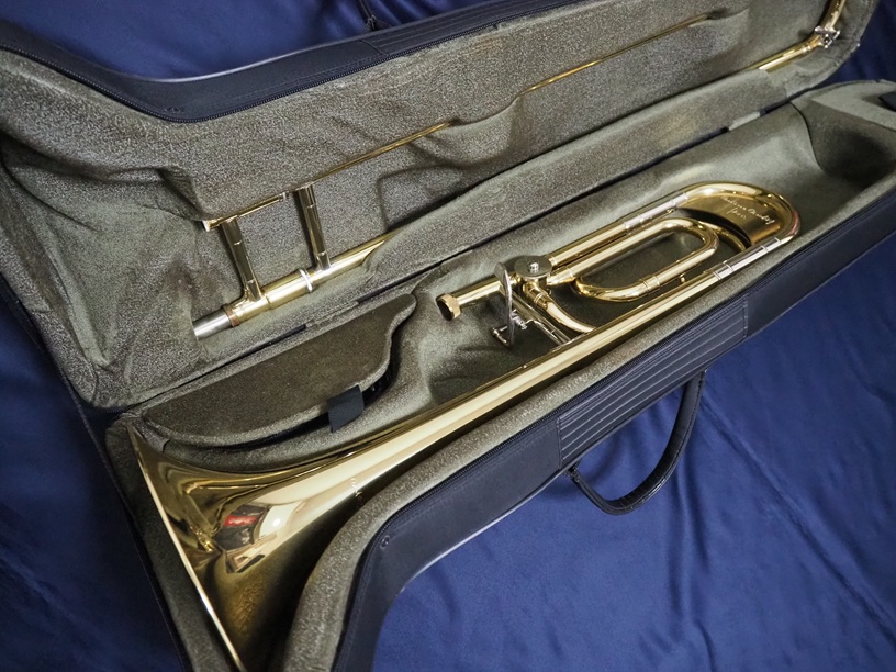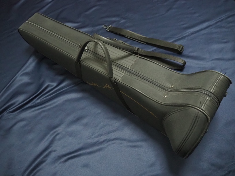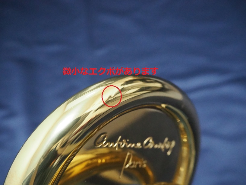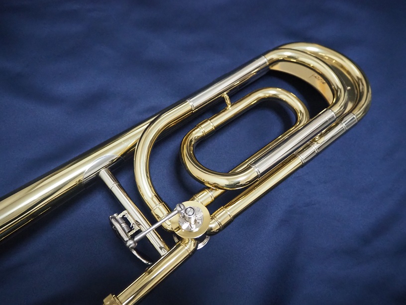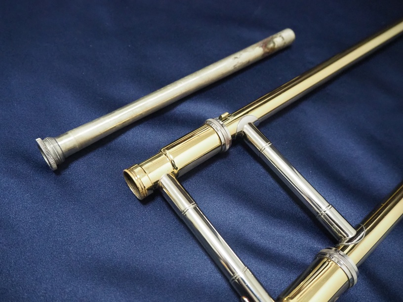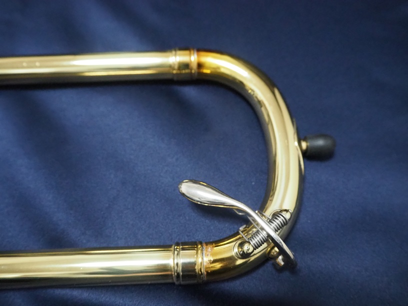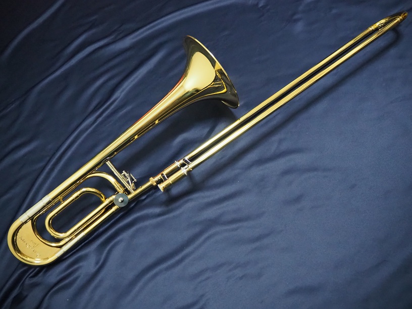 製造番号:3XXXX。支柱の台座が丸い比較的初期に生産された個体です。主管U字部やF管に1か所、ベルフレアにエクボや修理痕が点在するのと、スライドU字部の脱着によるラッカー焼けがある以外は、大きな凹みも摩耗もない美品です。当時のBam社製の純正ケースが付属します。